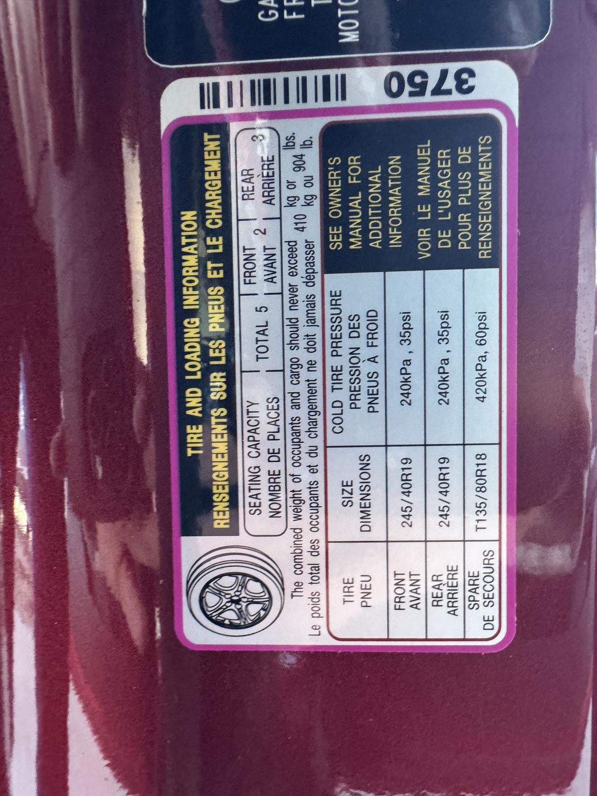 - Front Tire Size: P245/40WR19